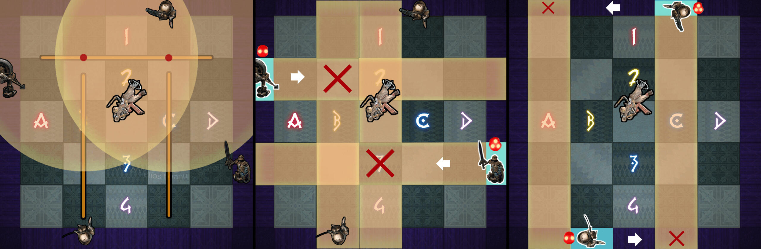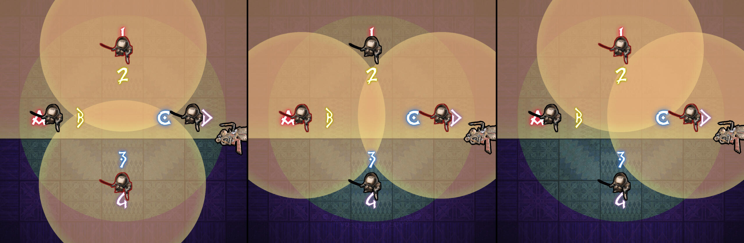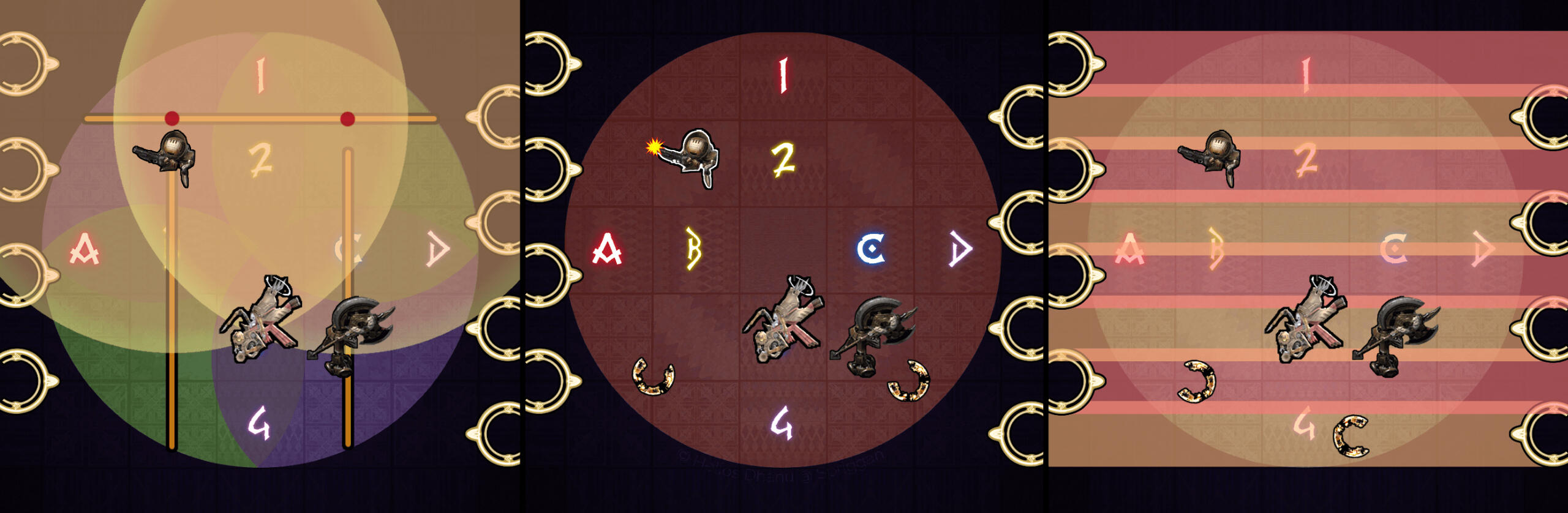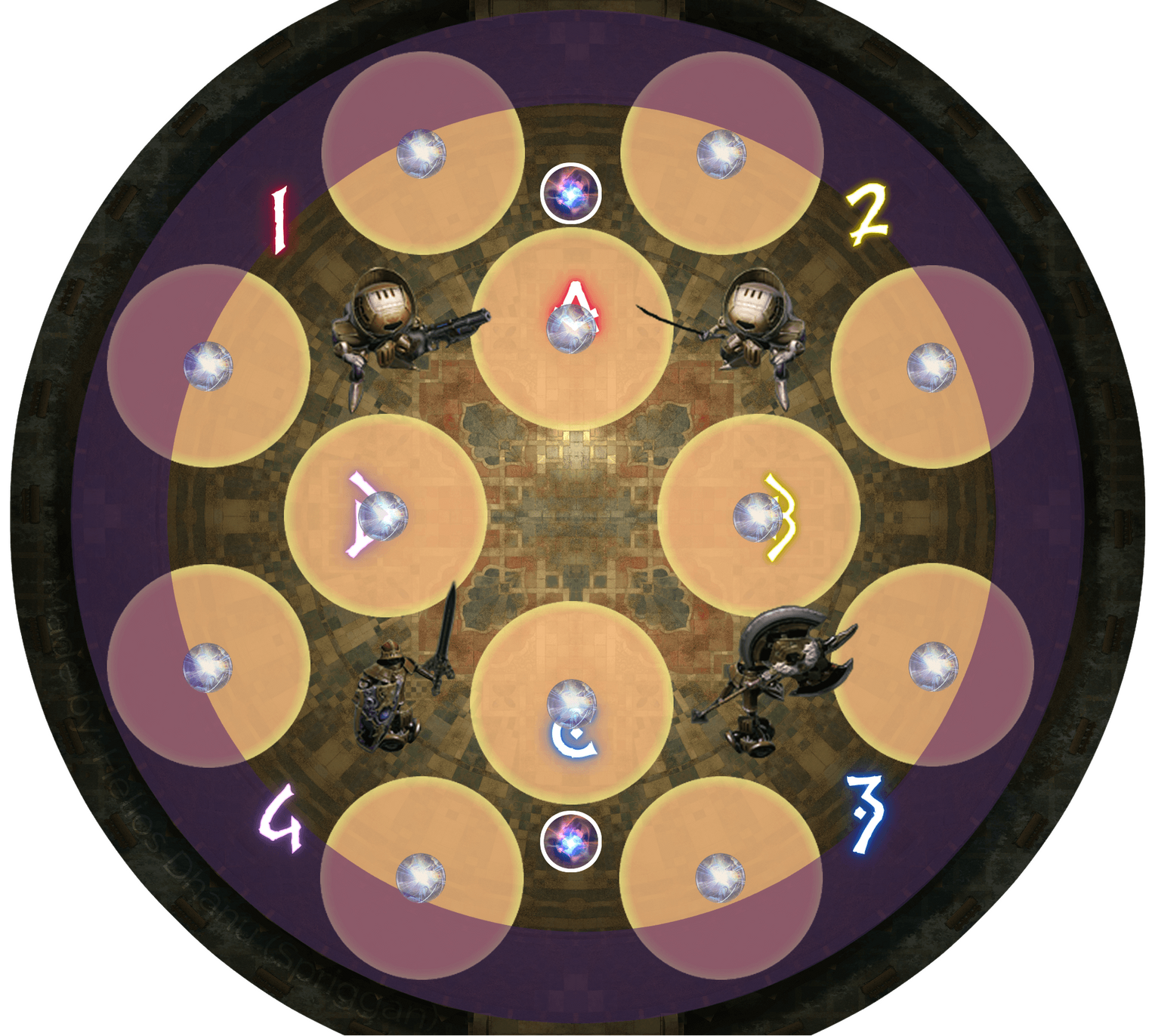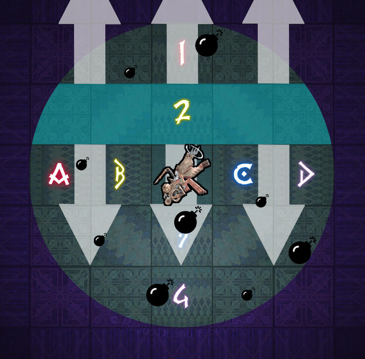 - 2 by 2 Guards will step a number indicated above their heads, & use a cross-shaped AoE